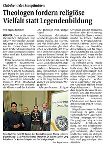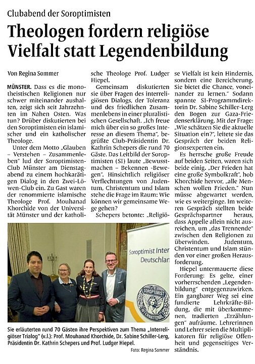 Prof. Dr. Mouhanad Khorchide, Leiter des Zentrums für islamische Theologie und Dipl.-Theol. Ludger Hiepel M.A. vom Institut für biblische Exegese und zugleich Antisemitismusbeauftragter der Universität Münster. Sie führten aus ihrer jeweiligen Perspektive in die Schwierigkeiten des Austauschs zwischen den Religionen ein und breiteten gemeinsam aber vor allem die großen Chancen einer Nähe aus, die auf den gemeinsamen Stammvater zurückgeht. Beide Referenten arbeiten in vielen Projekten zusammen um die manifesten Narrative der Feindschaften abzubauen, denn die alten Quellen geben durchaus ein anderes Bild. Gerade für die junge Generation, die mit verkürzten und falschen Informationen auf social media konfrontiert wird, ist es wichtig eine andere Sicht und Möglichkeit zu eröffnen. Weshalb sich die Gesprächspartner einsetzten, gemeinsam die Chancen der Vielfalt zu betonen und die Hoffnung zu befördern, dass eine friedliches Nebeneinander auch in die Familien getragen wird und in Zukunft weiterhin herausgestellt werden muss, wie kleine Erfolge bereits Wirkung zeigen.